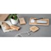 Bateria portátil com carregador wireless em bambu. Bateria de lítio com capacidade de 5.000mAh e tempo de vida ≥ 500 ciclos. Contém entrada/saída de 5V/2A, indicador de carga, 1 porta micro USB, 1 porta USB tipo C e 1 porta USB. Potência de saída wireless, no máximo, de 5W. Incluso cabo USB/micro USB para carregar. Compatível com smartphones com tecnologia de carregamento sem fios. Fornecida em caixa pressente. 140 x 70 x 12 mm